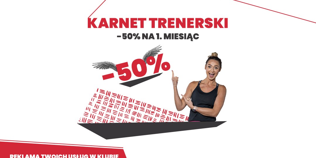 Odbierz 50% rabatu na pierwszy miesiąc karnetu i trenuj w komfortowych warunkach ze swoimi Podopiecznymi. Zapewniamy dostęp do wszystkich lokalizacji popularnej sieci klubów fitness oraz reklamę Twoich usług w naszym klubie.
